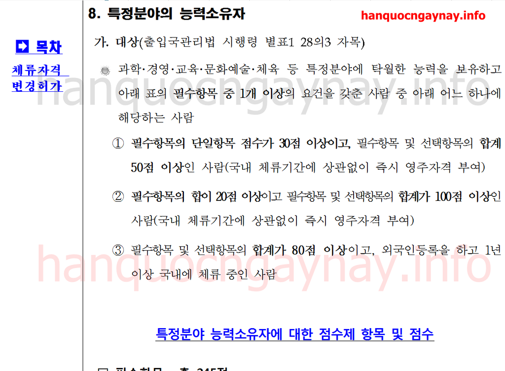 -> Thỏa mãn 80 điểm cho tổng hai phần và cư trú trên 1 năm tại Hàn Quốc.